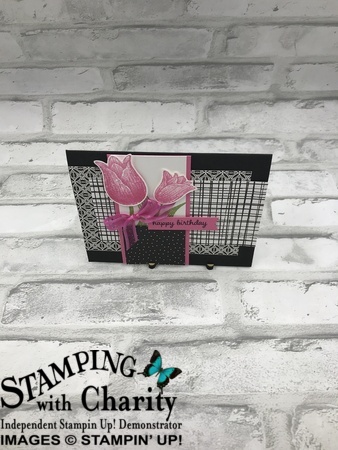 This card was made using the New In Color Polished Pink and the Timeless Tulips Stamp Set. This pop of color against the black make for a stunning card. Change the sentiment and you can have a card for any occasion.