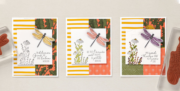 To begin creating our dragonfly cards, start simple. Fold Basic White Cardstock in half; add layers of Dandy Garden Designer Series Paper to the card front plus a floral image and sentiment stamped on Shimmery White Cardstock using Jet Black StazOn ink.The dragonfly is the crowning touch of this card, but how did we make it? Piece of cake! We sized the dragonflies on our Dandy Garden Designer Series Paper to fit the Dragonfly Punch, so you can easily “capture” them for use as accents on cards and other projects.Simply punch your favorite dragonfly from the Designer Series Paper and adhere it to the card front with Stampin’ Dimensionals; it almost appears to hover above the paper! This classy card takes only minutes to create—making it perfect for a casual crafter.