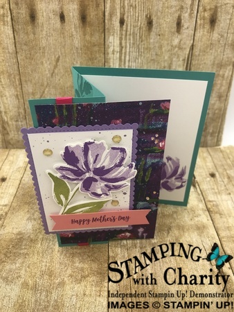 Step up our second card by adhering an additional layer of Dandy Garden Designer Series Paper. We also added a little color to the stamped floral image using Water Painters. The Bumblebee and Pear Pizzazz inks really brighten the flower and bring it to life.